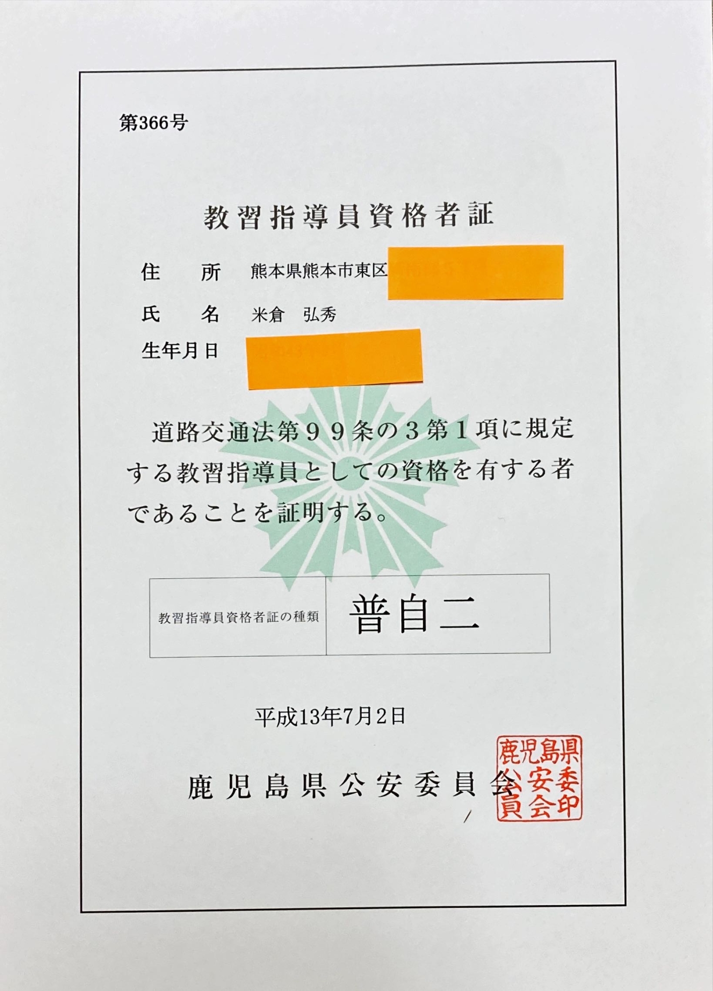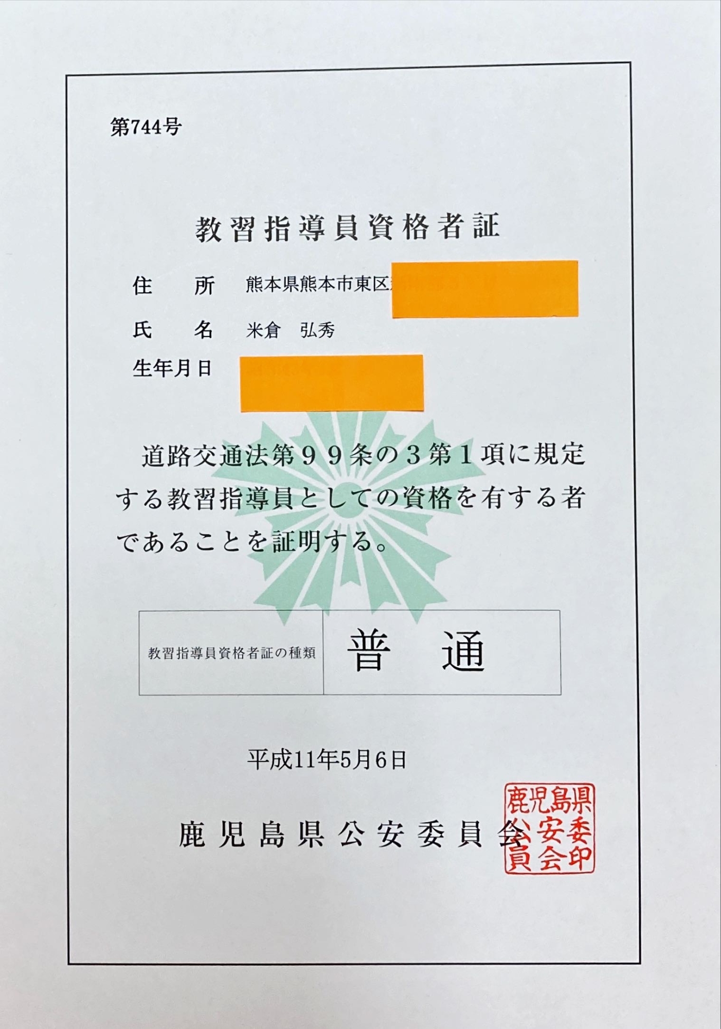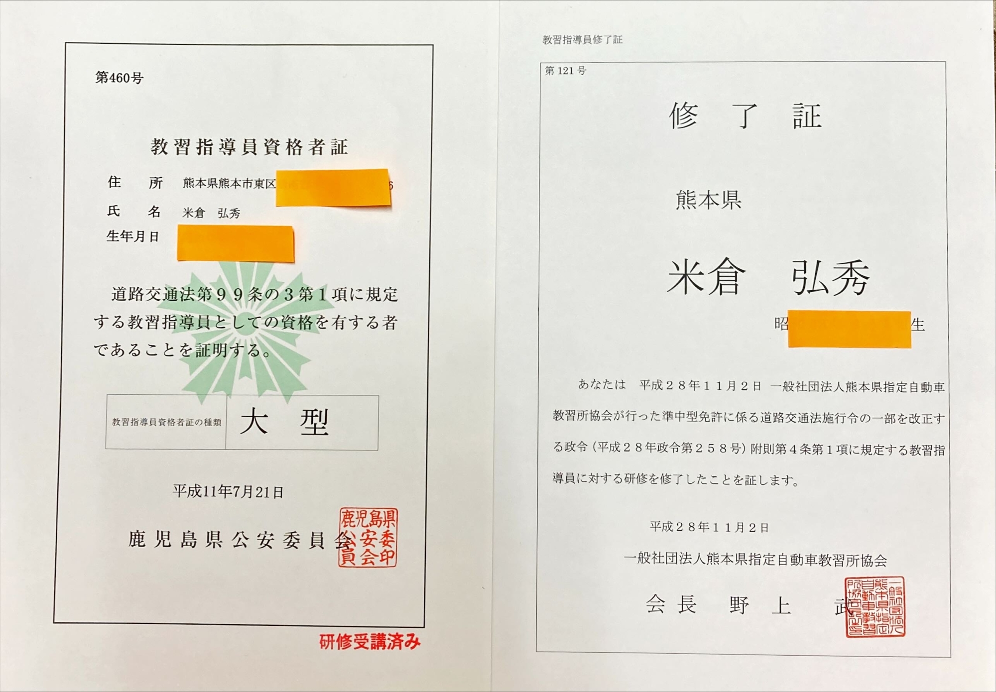 全て鹿児島県公安委員会・熊本県指定自動車教習所協会から交付されたものです。また、教習指導員資格は全国で活かせる資格となっております。